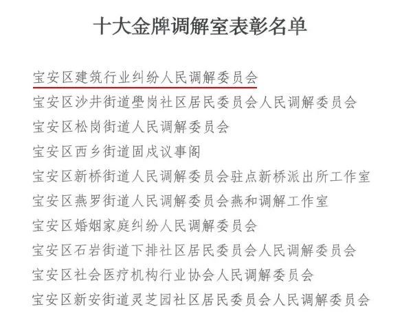 经区司法局、区人民法院、深圳市律师协会宝安区工作委员会、区调解协会组成的评委会专家会议认真讨论评审,宝安区建筑行业纠纷人民调解委员会被评为2022年度深圳市宝安区“十大金牌调解室”。